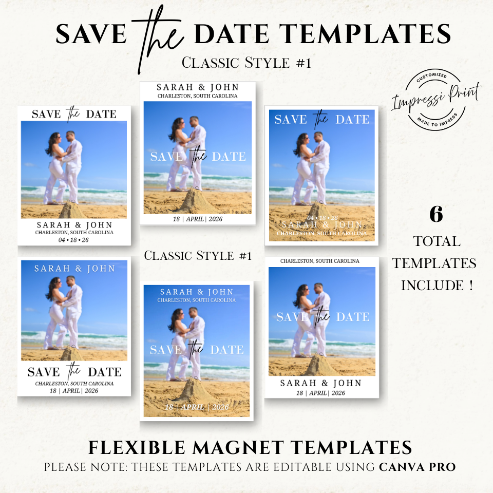 Create professional save the date flexible magnets designed to fit standard 3x4” flexible magnets — perfect for wedding invitations.